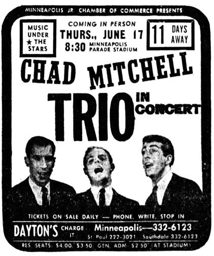 The Chad Mitchell Trio appeared at Parade Stadium in Minneapolis for the City’s Music Under the Stars series on June 17, 1965. John Denver had not yet joined the group.